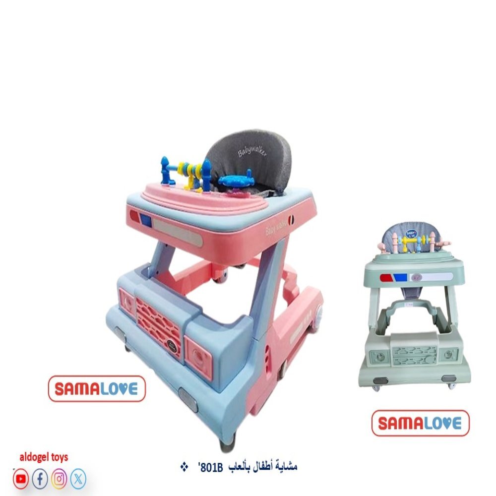 The SAMA LOVE 801B walker, with its eye-catching car design, provides your little one with a fun and safe active play experience at home. The front tray features interactive toys that capture your child’s attention and encourage them to reach for the toys, promoting hand-eye coordination. The wide base ensures excellent stability on tiles and parquet flooring, and the multi-directional wheels make maneuvering around furniture and moving between rooms easier and quieter. The frame, with its car-themed details (grille and decorative lights), adds an attractive touch, while the padded fabric seat provides comfort during extended periods and is easy to remove and clean.