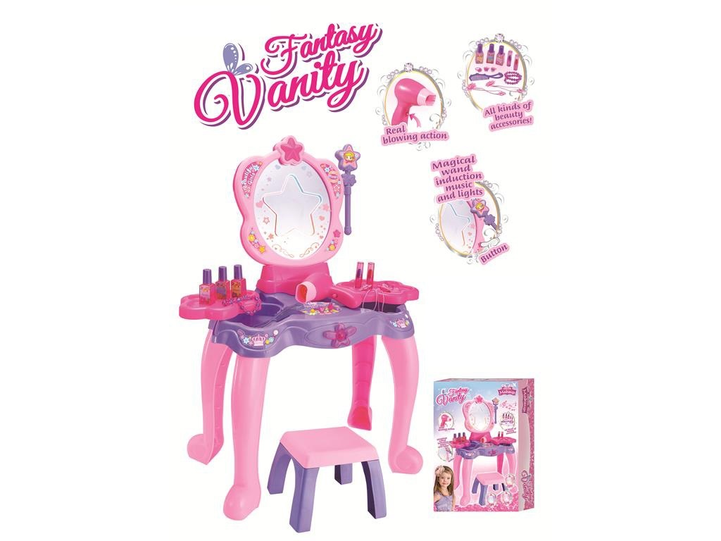 A stylish girls’ vanity set with an attractive design and lovely colors, offering your child a fun pretend play experience that mimics the world of real beauty. It includes a mirror and safe beauty accessories, along with light and sound effects that enhance the fun.