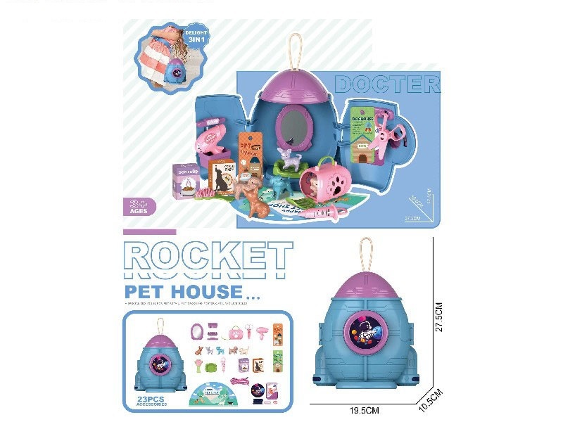 A unique girls’ playset featuring a rocket-shaped pet house, combining imaginative play and animal care. It comes with 23 accessories that help children role-play as a vet/animal caregiver in a fun and safe indoor experience.