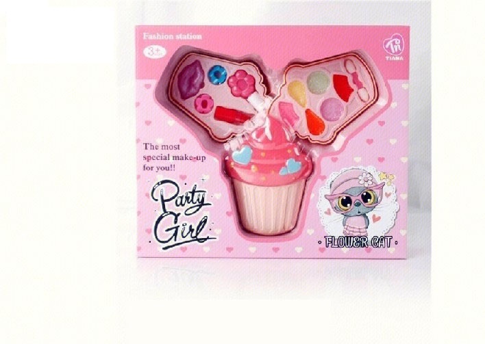 A cute and attractive cupcake-shaped makeup box for girls, designed for safe imaginative play. The box opens from both sides and contains colorful play makeup pieces that encourage children to be creative and imitate adults in a fun, screen-free way.