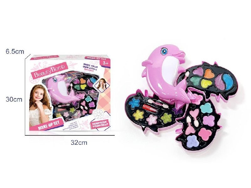 A cute dolphin-themed girls’ makeup set that opens like wings and contains makeup colors and safe play tools for children. Perfect for imaginative play and imitating adults in a fun and safe way.