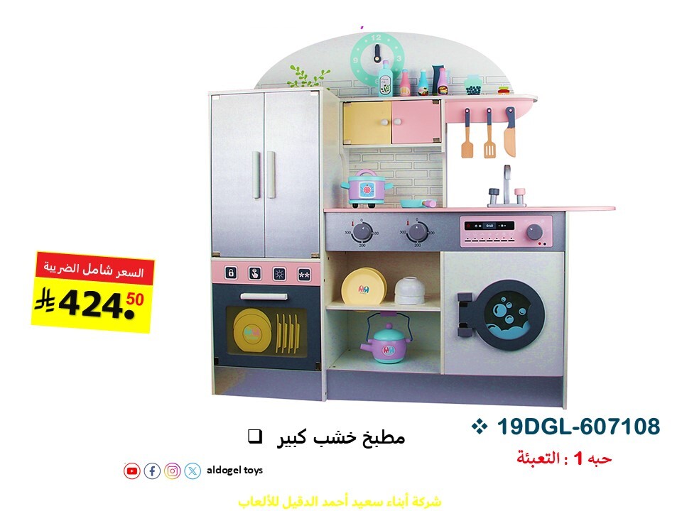 A realistic wooden kids’ kitchen that includes a refrigerator, stove, sink, washing machine, microwave, shelves, and various kitchen accessories.