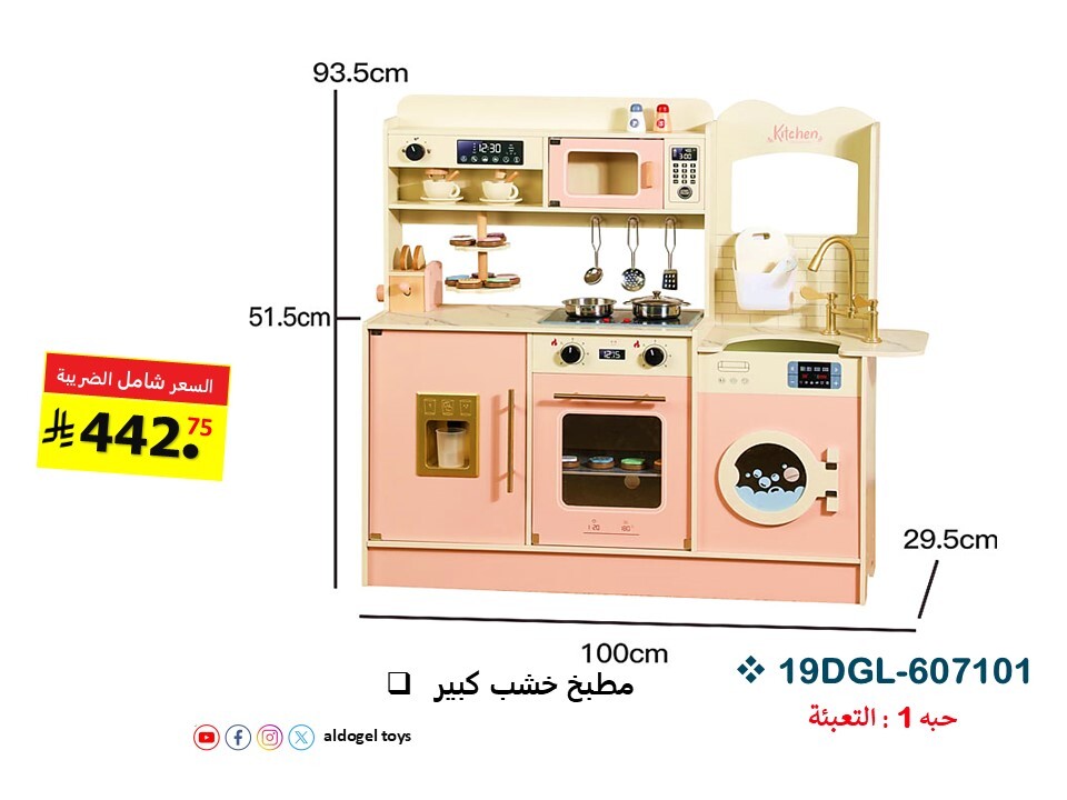 A complete wooden kitchen for kids with a realistic design and attractive pink and creamy colors.