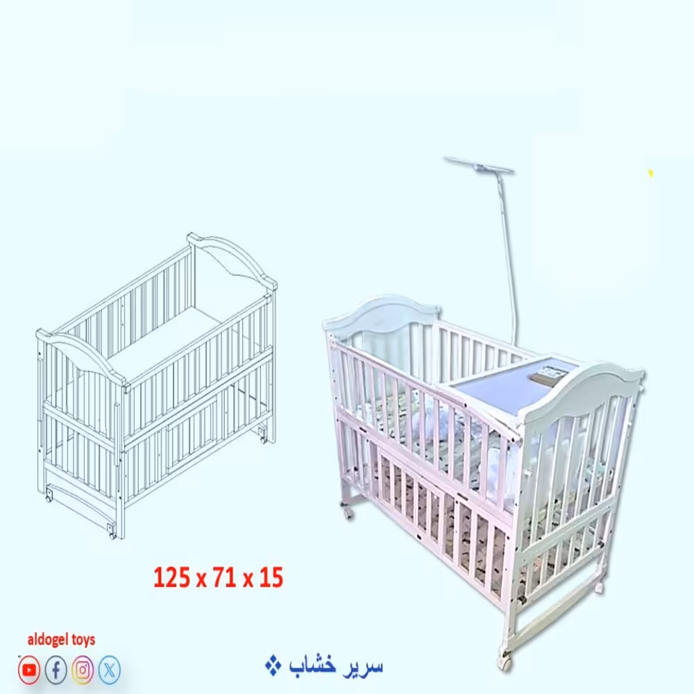 This sturdy wooden crib with a stylish white finish complements any décor. It features wheels for easy movement between rooms and a locking mechanism for secure placement during sleep. The high rails provide added safety for your baby, and the base allows for gentle rocking to soothe them. A mosquito net can be attached for added protection, and the crib is easy to assemble. Its compact dimensions of 125 x 71 x 15 cm make it convenient for transport and storage.