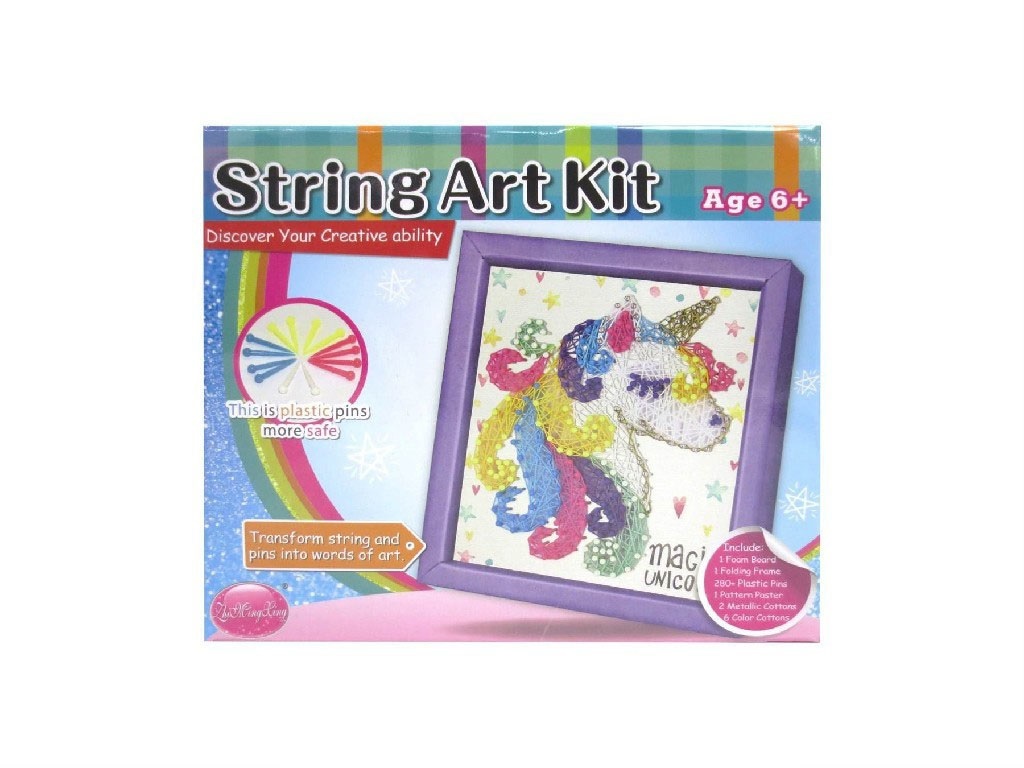 A unique string art kit for creating a unicorn artwork using colorful yarn and safe plastic pins. It provides a fun and engaging art experience, transforming the yarn into a beautiful piece of art that can be displayed or hung up.