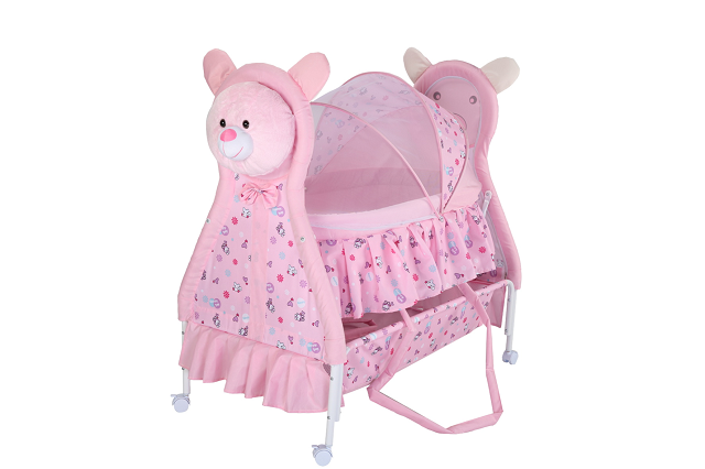 سرير بناتي هزاز على شكل دبدوب وبعجلات وناموسية