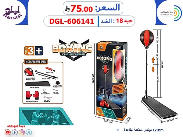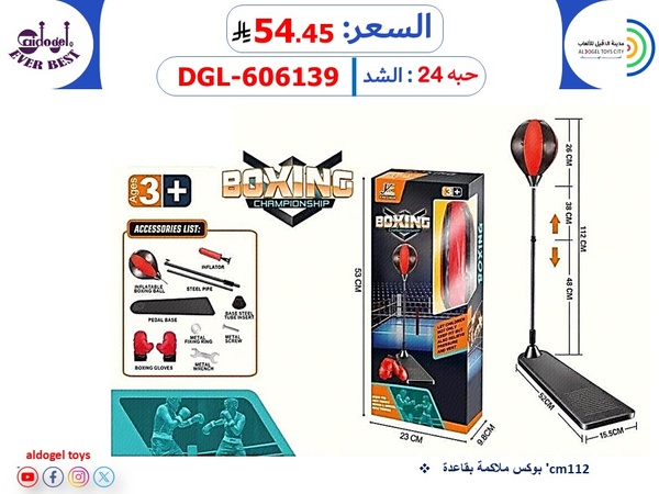 طقم البوكس بقاعدة DGL-606139 يعطي طفلك تجربة ملاكمة ممتعة وآمنة داخل البيت. العمود المعدني يتجمع بسهولة ويتيح لك تعديل الارتفاع حتى 112 سم-120 سم – 128 عشان يناسب أعمار مختلفة، بينما القاعدة المدمجة 52×15.5 سم توفّر ثبات جيد بدون ما تاخذ مساحة. الكرّة قابلة للنفخ ومعها منفاخ داخل العلبة، بالإضافة إلى قفازات أطفال لسلامة اليدين. يجي معه حلق تثبيت وبراغي ومفتاح لتجميع محكم وسريع. مناسب لعمر 3 سنوات فأكثر، ويساعد على تصريف الطاقة، ورفع اللياقة، وتحسين التركيز وردّة الفعل بطريقة مسلية داخل المنزل أو الاستراحة.