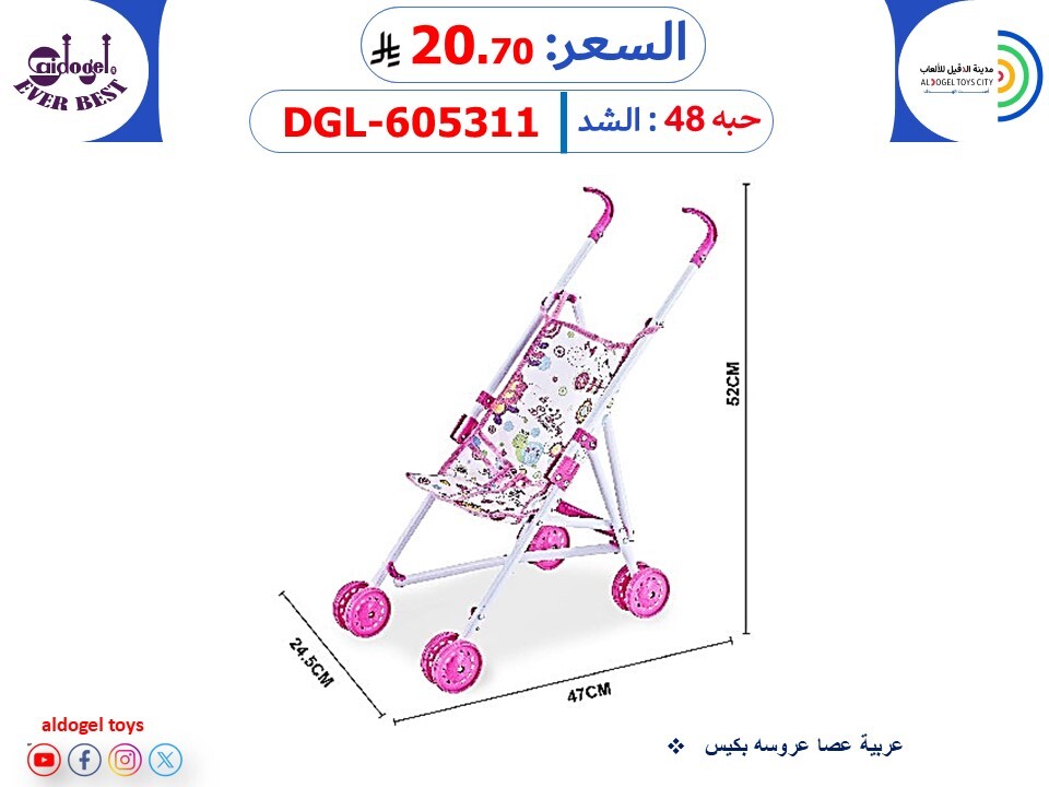 عربية العروسة DGL-605311 خيار عملي وخفيف للّعب التمثيلي اليومي. تصميم العصا القابل للطيّ يخلي الطيّ والحمل سهل، ومع وجود الكيس تقدر الطفلة تاخذ عربيتها معها للزيارة أو الاستراحة بدون فوضى. المقاس الصغير (حوالي 52×47×24.5 سم) مناسب لقبضة اليد الصغيرة وللدفع داخل البيت، والعجلات البلاستيكية تعطي حركة سلسة على البلاط والسجاد الخفيف.