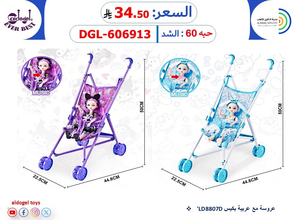 طقم DGL-606913 يجمع كل اللي تحبه البنوتة: عروسة لطيفة مع عربية لعب قابلة للطيّ بوزن خفيف وحجم مناسب (50×44.8×22.5 سم). التصميم يجي بلونين مبهجين—بنفسجي وأزرق—مع قماش مطبوع ورسومات طفولية تضيف لمسة لطافة. الأجمل إن العربية مزوّدة بزر MUSIC يشغّل موسيقى ممتعة تخلّي التجربة تفاعلية أكثر. بفضل آلية الطيّ والتعبئة بكيس، تقدري تاخذينها بسهولة للزيارات أو الاستراحة بدون ما تاخذ مساحة.