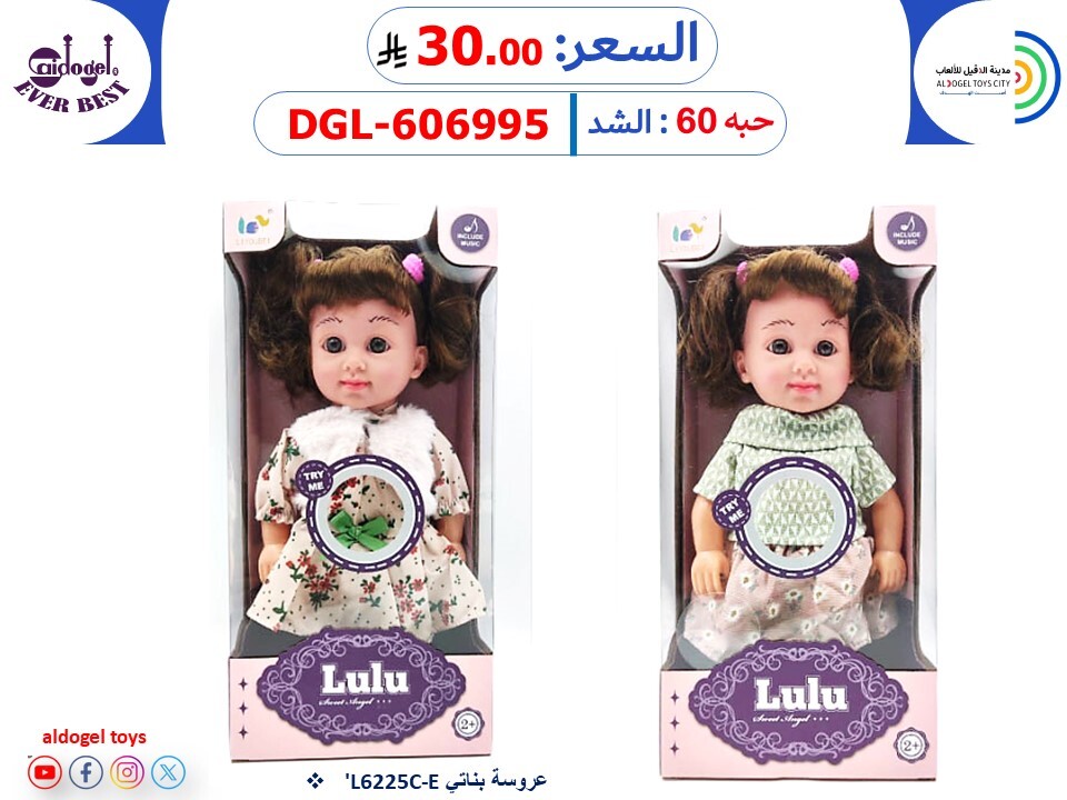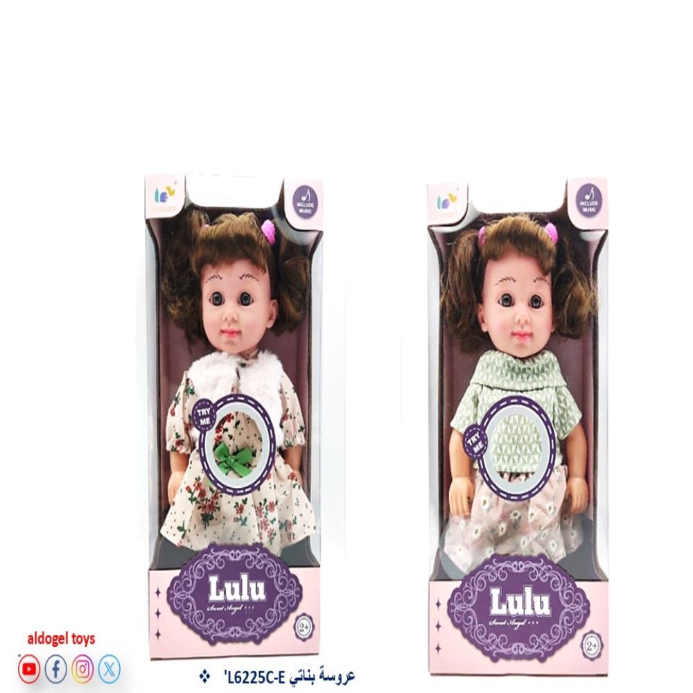 عروسة Lulu موديل L6225C-E برمز DGL-606995 بتقدّم مزيج جميل بين المتعة والتعلّم. تصميمها اللطيف وألوان الفساتين الهادية يخلّي طفلك يعيش أجواء القصص والتمثيل، ومع زر Try Me وميزة Include Music تزيد تفاعلية اللعب وتشدّ الانتباه من أول لحظة.