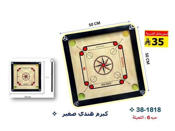حجم عملي: لوح كيرم هندي مقاس 50×50 سم مناسب للطاولة وما ياخذ مساحة في البيت أو الاستراحة.