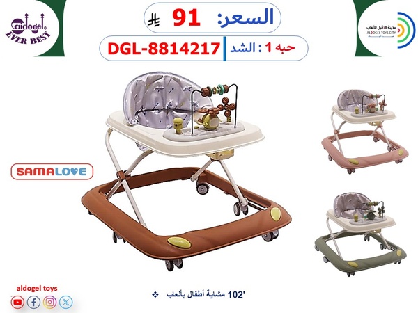 مشاية SAMA LOVE موديل 102 صُمِّمت لتكون رفيق آمن وممتع لخطوات طفلك الأولى. القاعدة العريضة تمنح ثبات ممتاز على البلاط والباركيه، ومع العجلات متعددة الاتجاهات تقدرين تتحكّمين بسهولة بحركة المشاية داخل الغرف وحول الأثاث. في المقدمة قوس ألعاب بشكل متاهة خرز وألعاب صغيرة تشدّ انتباه الصغير وتساعده على تنمية مهاراته الحركية الدقيقة وتنسيق العين مع اليد. المقعد القماشي المبطّن مريح للجلسة الطويلة وسهل الفك والتنظيف للحفاظ على النظافة.