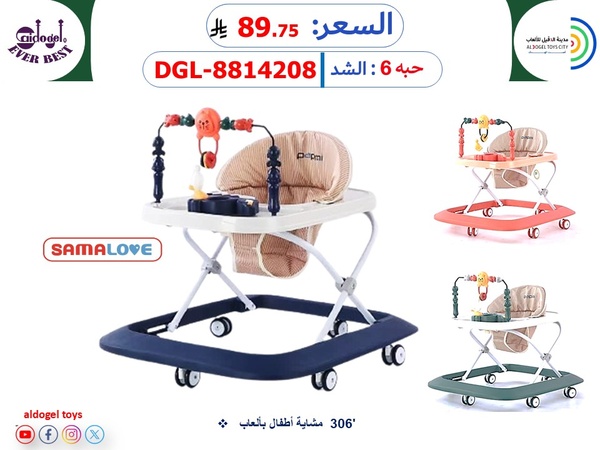 مشاية الأطفال من SAMA LOVE موديل 306 مصممة تعطي صغيرك بداية آمنة وممتعة في خطواته الأولى. القاعدة العريضة تمنح ثبات عالي على البلاط والباركيه، ومع العجلات متعددة الاتجاهات يصير تحريك المشاية داخل الغرف والالتفاف حول الأثاث أسهل عليك وعلى الطفل. في الأمام قوس ألعاب لطيف يجذب انتباهه ويحفّزه يمد يده ويتفاعل، بينما توفّر الصينية مساحة عملية للألعاب الخفيفة. المقعد القماشي المبطّن يضمن راحة خلال الجلسات الطويلة، ويمكن فكه وتنظيفه بكل سهولة.