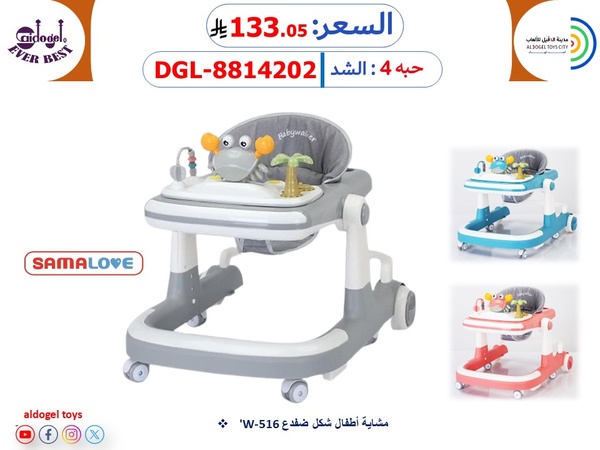 مشاية الأطفال من SAMA LOVE موديل W-516 تجمع بين شكل ضفدع لطيف وتجربة استخدام عملية داخل البيت. الصينية الأمامية مزوّدة بألعاب تفاعلية (ضفدع، نخلة، خرز) تشجّع الصغير يمد يده ويستكشف، وتساعده على تنمية التنسيق بين العين واليد. بفضل القاعدة العريضة تحصلي على ثبات عالي أثناء الحركة، ومع العجلات متعددة الاتجاهات يصير الالتفاف حول الأثاث والانتقال بين الغرف أكثر سلاسة. المقعد القماشي المبطّن يوفّر راحة ممتازة ويمكن فكه وتنظيفه بسهولة للحفاظ على نظافة المشاية